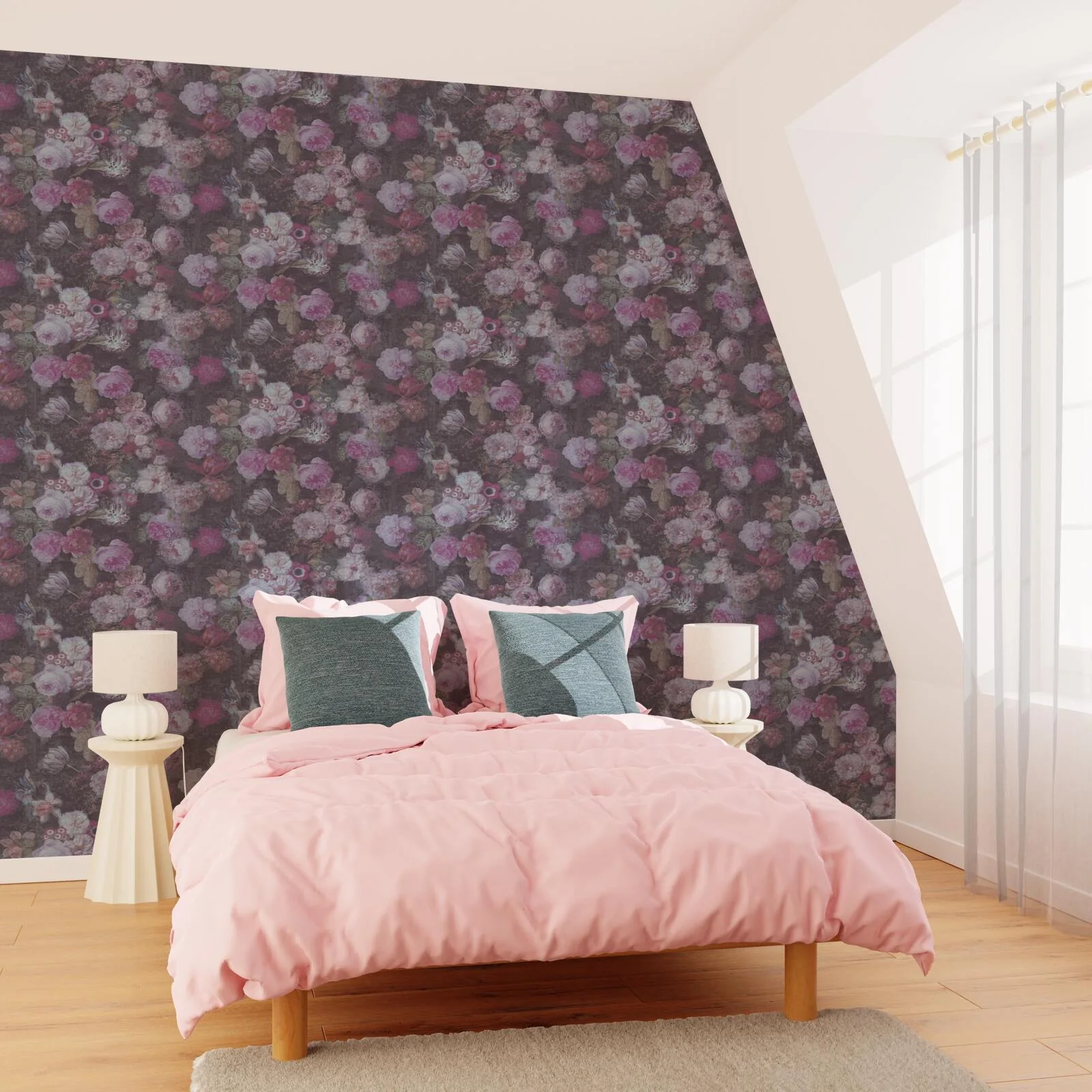 Imaginez ces somptueuses fleurs ornant votre mur comme une fresque romantique. Les roses, les pivoines et les anĂ©mones crĂ©ent un tableau envoĂ»tant qui capte lâattention et invite Ă la rĂȘverie. Avec ses nuances riches de rose, de pourpre et de bordeaux sur un fond sombre, CLAUDIA apporte une profondeur et une Ă©lĂ©gance incomparable Ă votre dĂ©coration.
