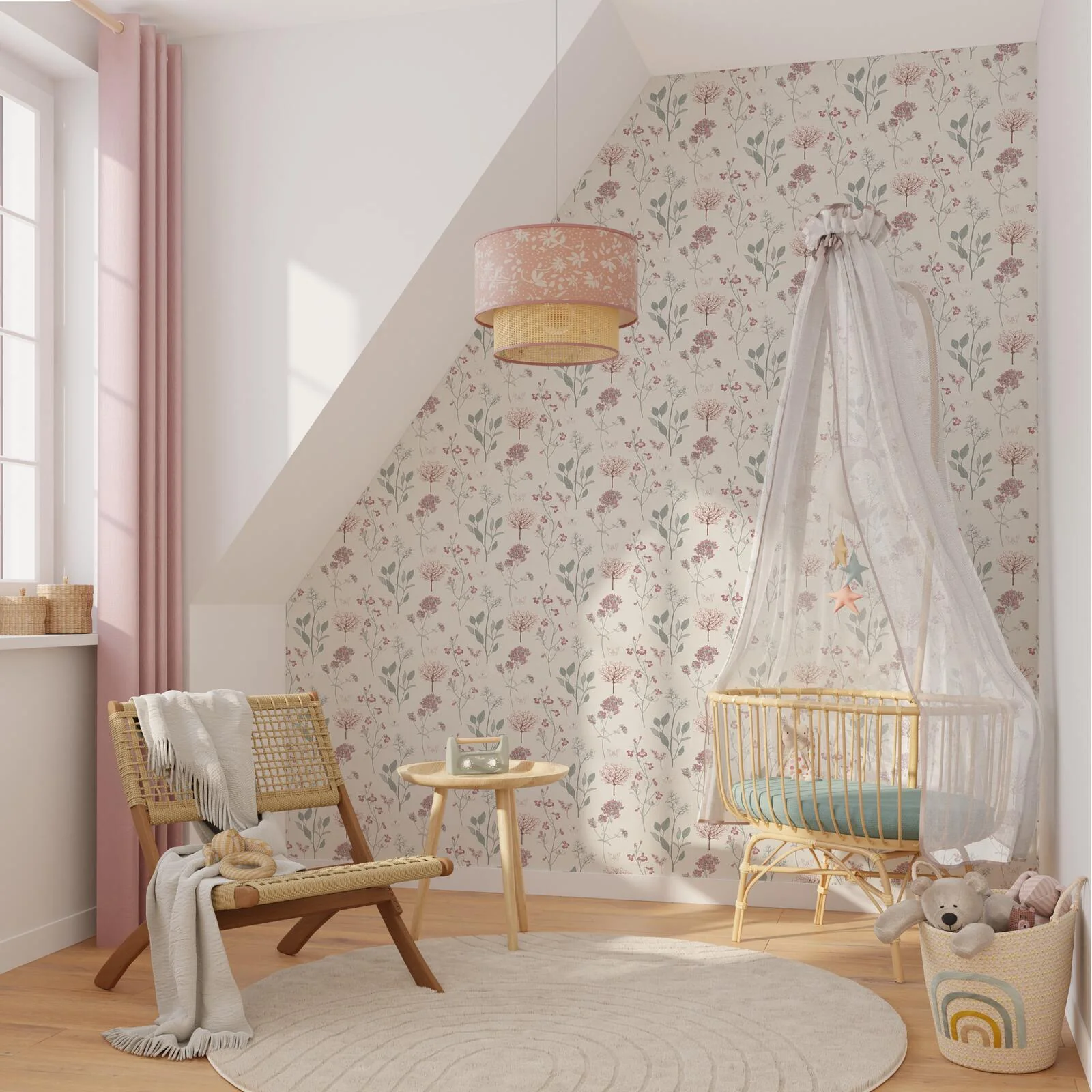 Les couleurs tendres et les motifs herbiers du papier peint LOUISE sont parfaits pour créer une décoration romantique et bucolique. Le vert-de-gris et la terracotta apportent des nuances discrÚtes et naturelles.