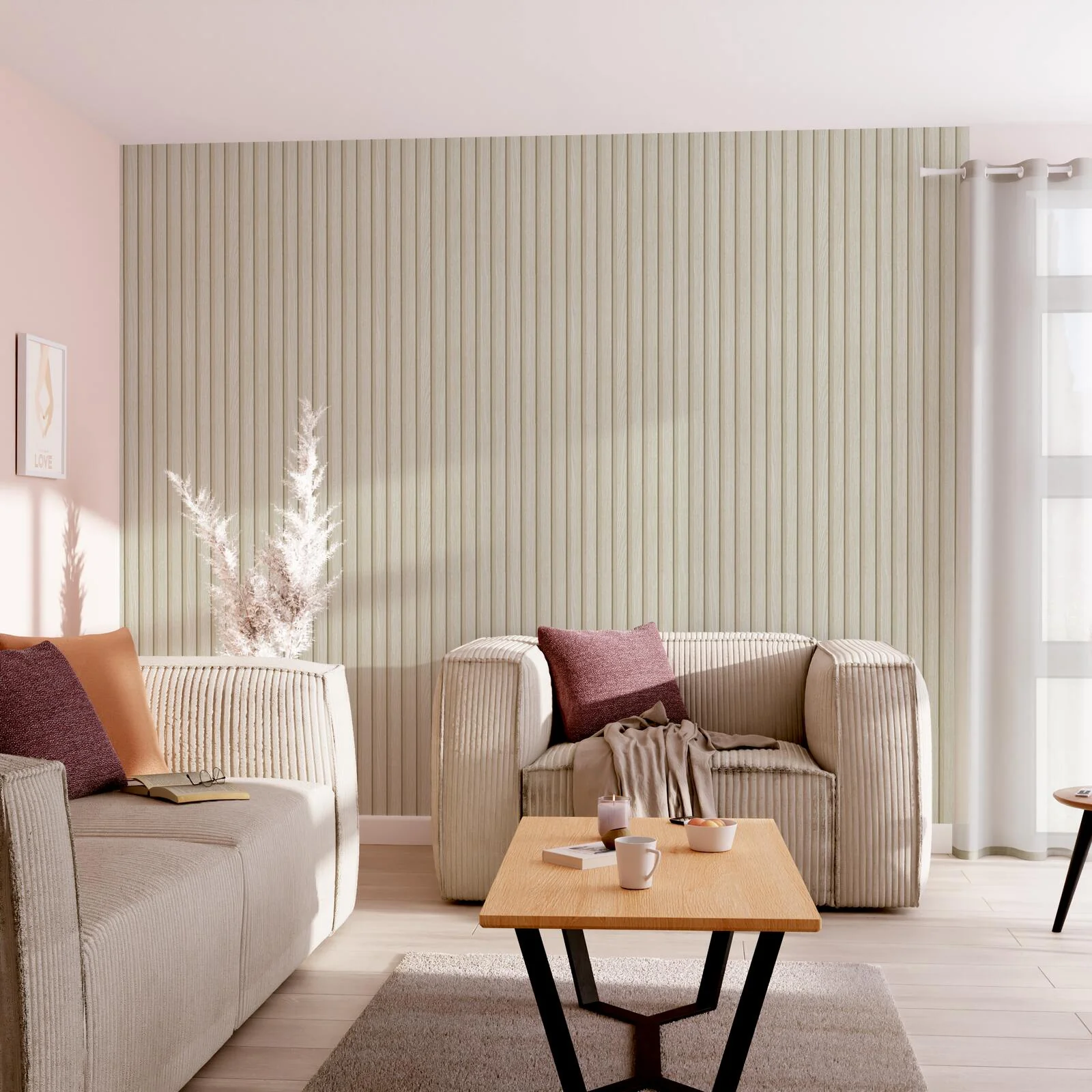 Avec ses couleurs claires, le papier peint tasseaux de bois naturel confĂšre un aspect brut Ă la piĂšce. Mixez-le Ă du mobilier blanc pour accentuer le cĂŽtĂ© romantique et lĂ©gĂšrement rĂ©tro de votre salon ou de votre chambre Ă coucher. Pour encore plus dâoriginalitĂ©, posez le papier peint TASSEAUX jusquâĂ mi-hauteur uniquement et associez-le Ă une peinture couleur crĂšme.