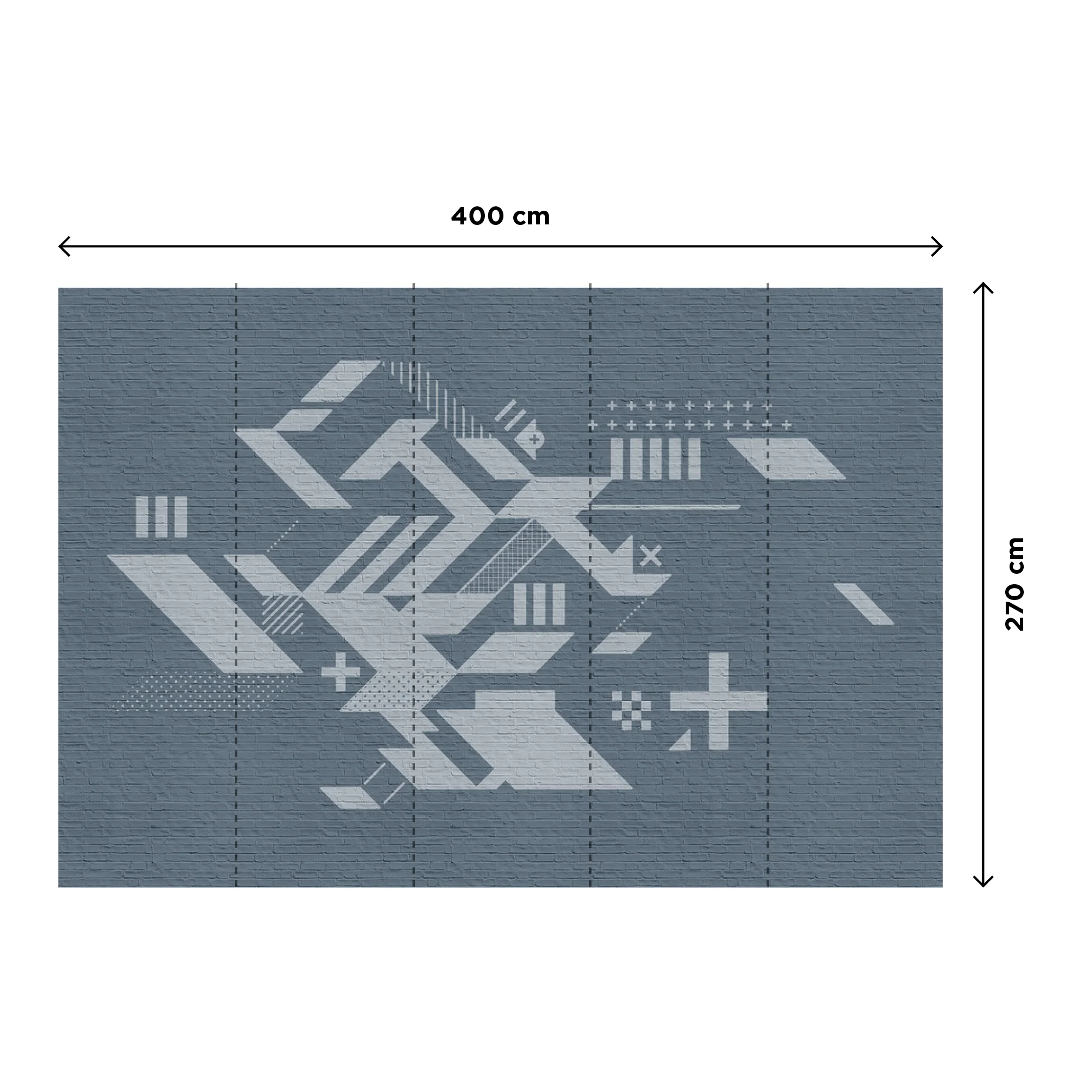 Des carrés, des parallélogrammes, des croix s'entrelacent avec une précision hypnotique et créent une esthétique géométrique moderne et élégante. Le fond briques couleur bleu jean apporte une touche urbaine, évoquant à la fois le style industriel et le dynamisme des espaces urbains.