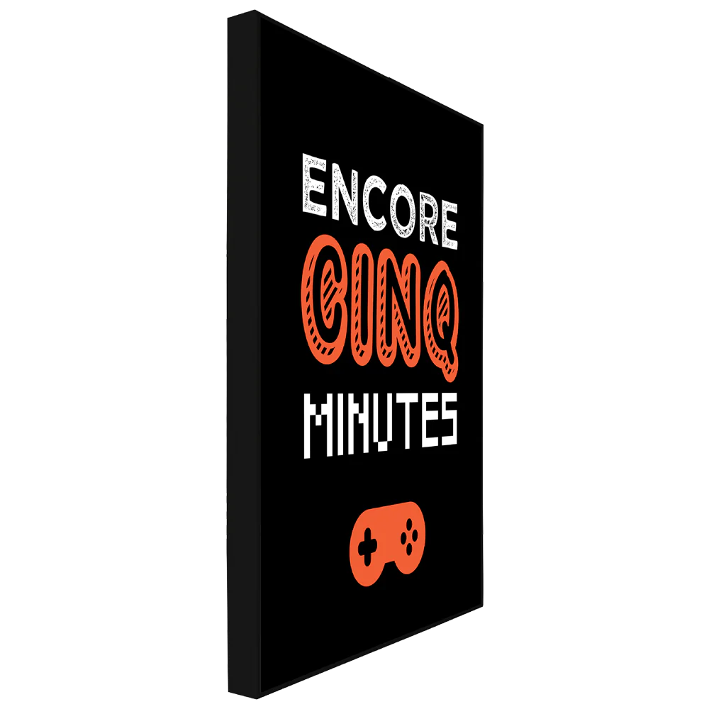 Cette création 4Murs made in France de 50 par 40 centimètres est un moyen amusant de décorer la chambre de votre enfant avec une phrase qui le représente bien. Noir et orange, elle représente aussi une manette de console de jeu qui précise que ces cinq minutes ne sont pas consacrées à la lecture d’une encyclopédie ou à la réalisation d’une peinture à l’aquarelle.